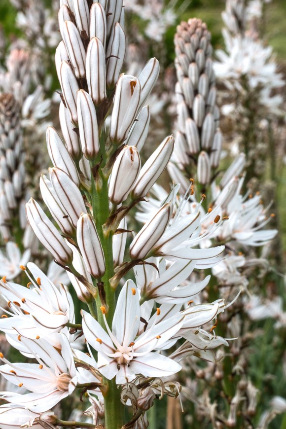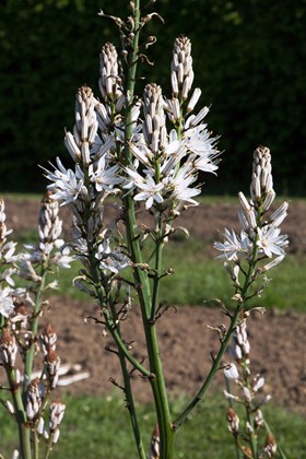 Asphelus albus, a native of Central and Southern Europe and North Africa. with its broadly branching habit makes a strong structural statement in a border or scree bed. It is in early growth throughout the winter so is only suitable for autumn planting. The branched stems carry white star-shaped flowers with fine brown lined backs. It flowers in Summer and reaches 36-60" (90-150cm). They form big root balls akin to Dahlias.