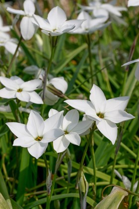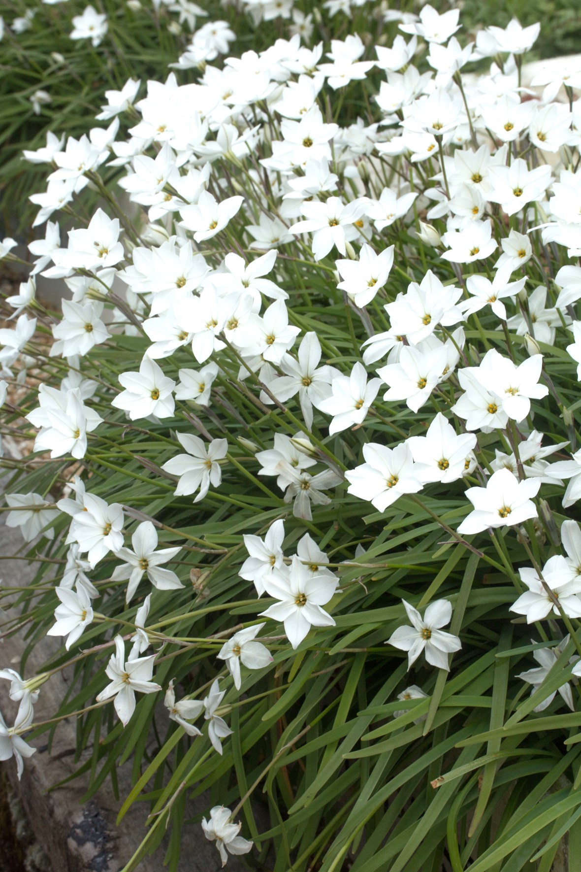 Ipheion Alberto Castillo is vigorous, with very white starry flowers over grey green foliage smelling of onions when crushed. Longer stemmed, which raises the flowers well above the foliage and they pick well for small posies but to prevent those longer stems from flopping you must plant them in fairly good light.