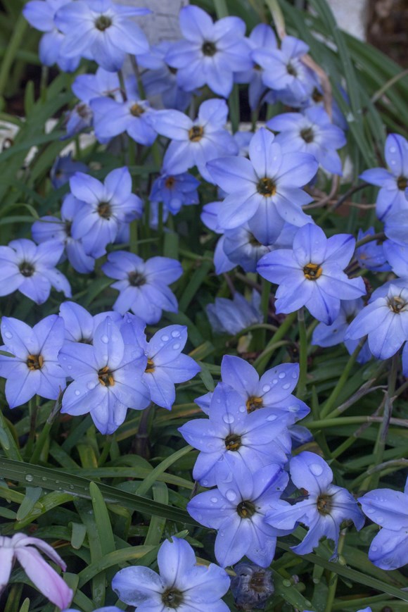 Ipheion Rolf Fiedler has broader and more fleshy leaved than the I. uniflorum varieties and consequently (I think) maybe not so tough. The flowers are flatter and an extraordinary blue, set off by the tips of the yellow stamens. They pick and stand up well as a small cut flower for a posy.