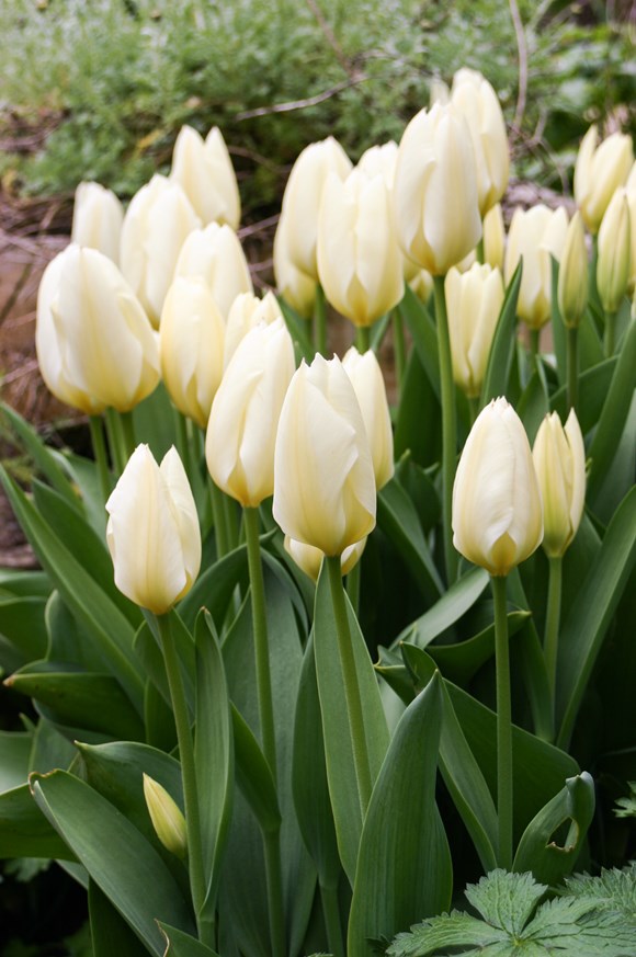 Tulip Purissima is one of the Fosteriana tulips, with its origins around Samarkand in Uzbekistan in Central Asia. Opening a pale primrose yellow, about which we receive a number of phone calls wondering whether a packing mistake has occurred, they turn through creamy shades to pure white and then in late March sunshine they open wide to reveal dramatic mascara black anthers. Strong stemmed over bright green leaves.