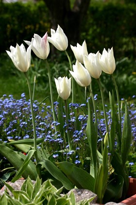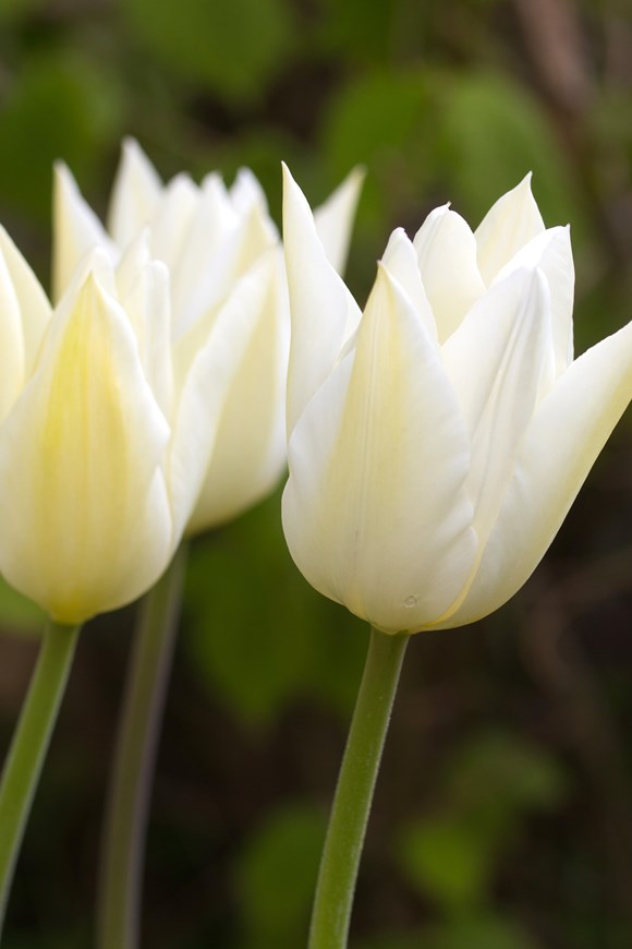 Tulipa White Triumphator is an an iconic and popular tulip, but not so typically lily flowered in its shape, all white with long clean green stems. They seem always more dramatic when provided with a stronger background against which to view them. Tulip White Triumphator is especially useful to separate difficult colours, or planted in combination with dark flowered tulips for added dramatic effect.