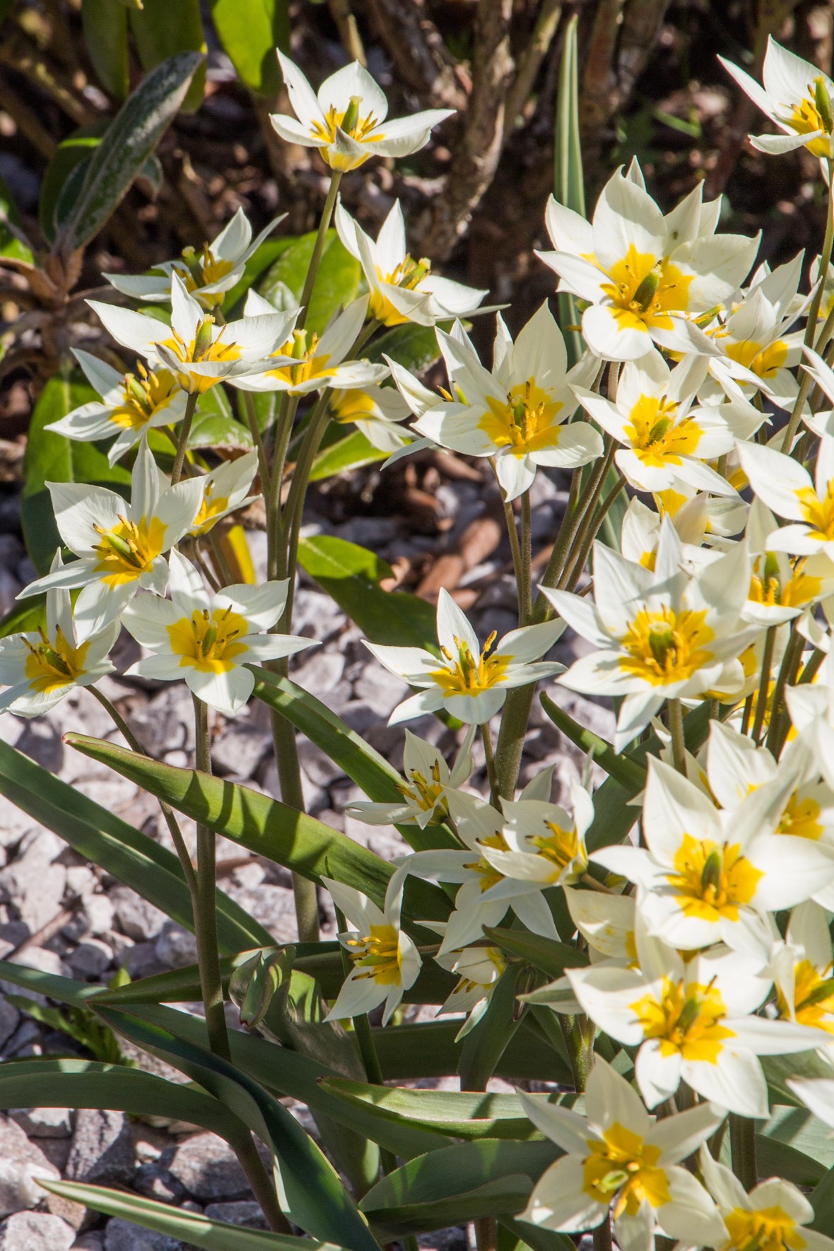 Tulipa turkestanica has ivory and cream flowers with dark anthers contrasting to the petals, greenish on their backs. It Is widespread in its natural range from SE Europe through to Iran and Russia. They need bright conditions out of too much wind. Characteristically red bulbed.