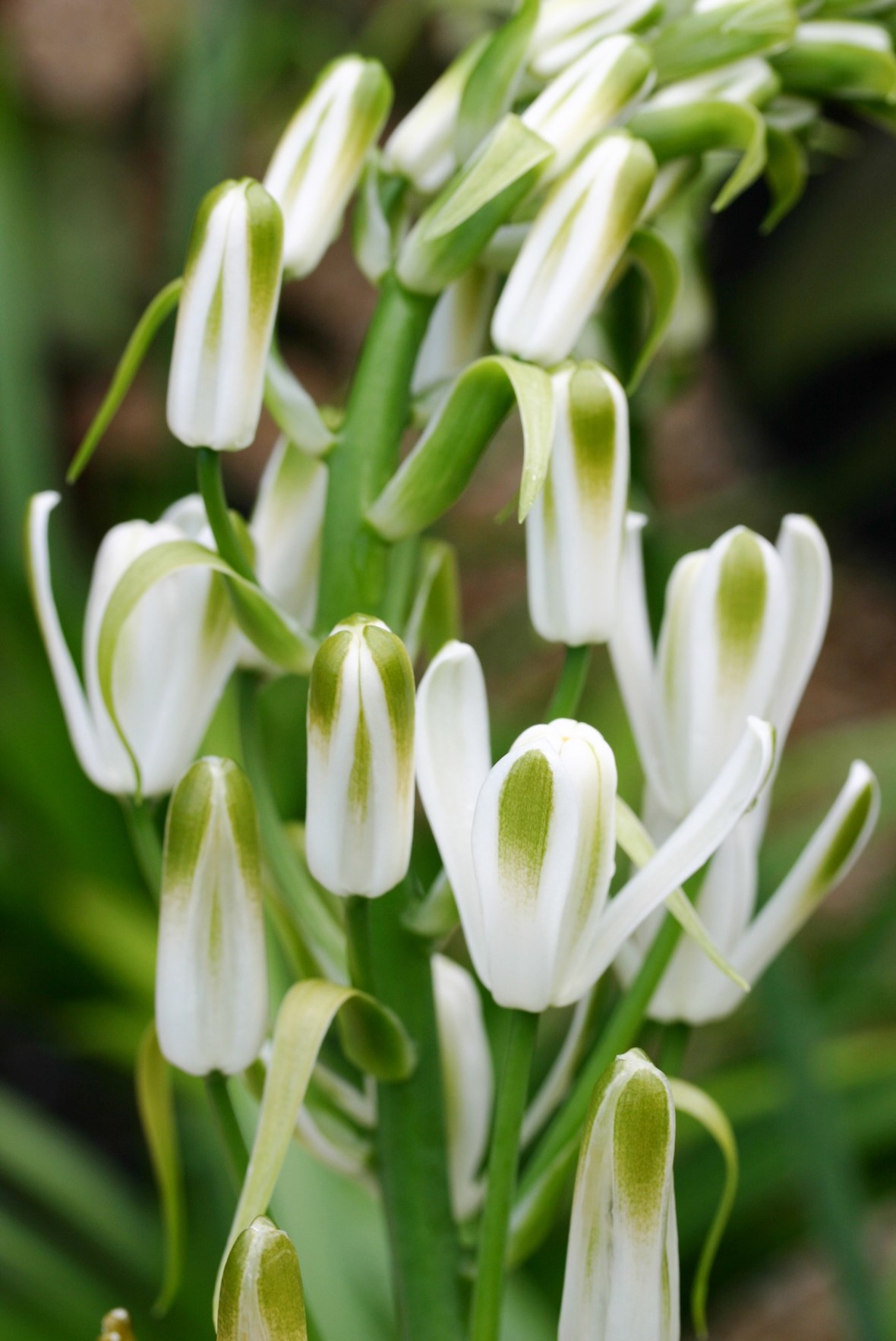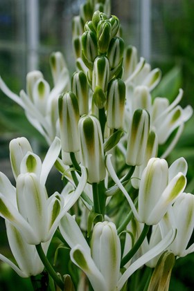 Ivory white, waxy flowers with green tips face upward around a tall raceme opening from the bottom of the spike for a long lasting display. The flowers are strongly almond scented. The foliage very glossy and also waxy. They can form huge bulbs which are often half in and half out of the soil and quite succulent in their nature. Not really hardy outside although a couple of degrees of frost will cause no harm. Best in a big pot where they can get winter protection They will hardly need any water during the winter. These will be roughly grapefruit sized bulbs