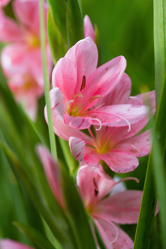 More upright than H. coccinea Major with flowers that do not seem to open so widely, but pretty in pink with deeper freckling. (Formally called Schizostylus)
