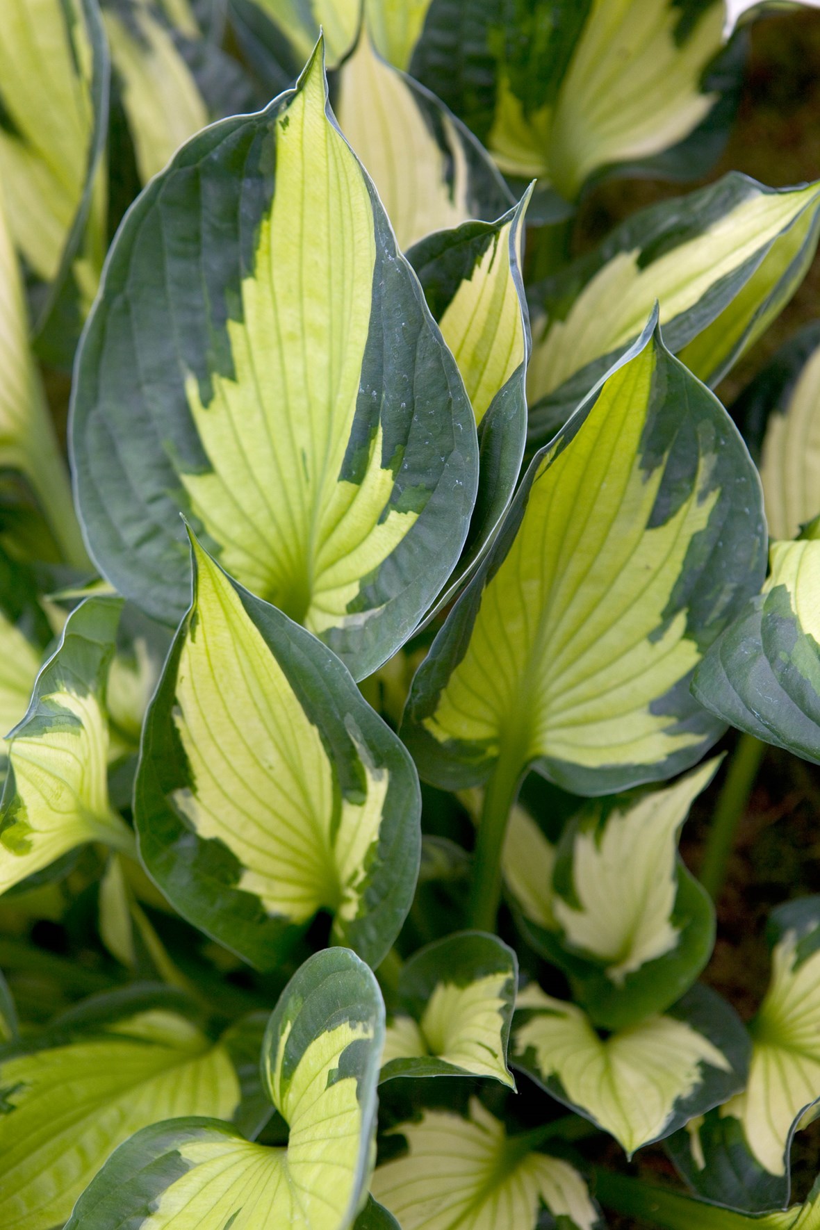 A very attractive and ever changing leaf structure. New leaves have a white/yellow centre, which them moves into a lime green, with the leaf margins being dark green. Lavender coloured flowers appear in the summer. Supplied as bare root division
