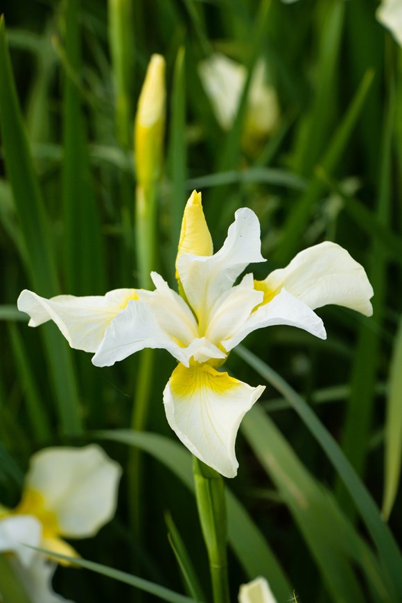Iris sibirica Dreaming Yellow has white standards with pale creamy falls while the centre is a darker yellow.